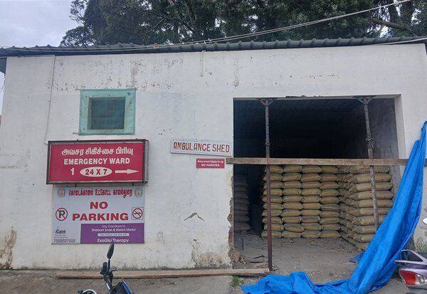 ஆம்புலன்ஸ் இடத்தில் சிமென்ட் கோடவுன் கண்டுகொள்ளாத மருத்துவமனை நிர்வாகம்