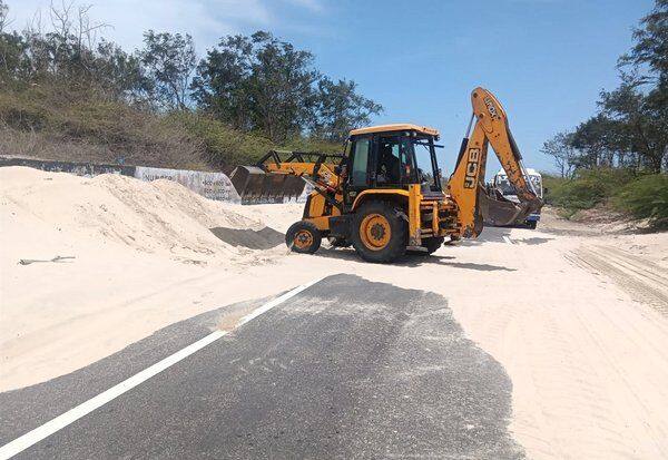 சூறாவளியால் சாலையில் மணல் குவியல்
