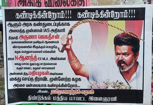இதைக் கண்டித்து, தமிழக அரசுக்கு எதிராக, திண்டுக்கல் மத்திய மாவட்ட த.வெ.க., இளைஞரணி சார்பில் வத்தலகுண்டு, நிலக்கோட்டை உள்ளிட்ட பகுதிகளில் போஸ்டர்கள் ஒட்டப்பட்டுள்ளன. அதில், தமிழக அரசு அமைத்துள்ள விசாரணை குழுவின் தலைவர் முன்னாள் நீதிபதி அருணா ஜெகதீசனை, முன்னாள் ஐ.ஏ.எஸ்., அதிகாரி என த.வெ.க.,வினர் குறிப்பிட்டுள்ளனர்.