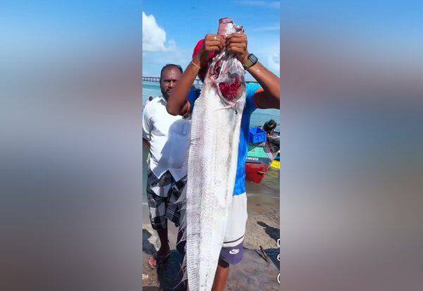 ராமேஸ்வரம் : ராமேஸ்வரம் அருகே பாம்பன் மீனவர் வலையில் அரிய மீன் இனமான 5 அடி நீளமுள்ள டூம்ஸ்டே மீன் சிக்கியது.