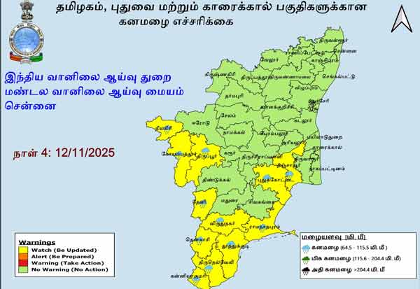 நவம்பர் 12ல் 12 மாவட்டங்கள், நவ., 13ல் 8 மாவட்டங்களுக்கு கனமழை எச்சரிக்கை