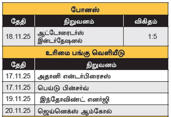 நிறுவன அறிவிப்புகள் நவம்பர் 16,2025 இந்த வாரம் போனஸ், உரிமை பங்கு வெளியீடு மற்றும் ஈவுத்தொகை அறிவித்துள்ள நிறுவனங்களின் பட்டியல்