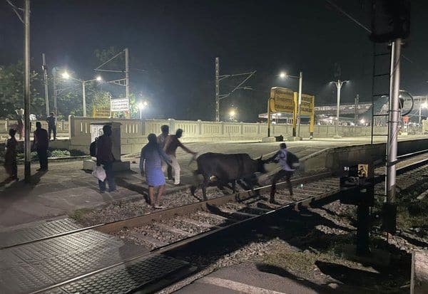 தண்டவாளத்தில் சுற்றித்திரிந்த பசு மாடு போராடி வெளியேற்றிய பயணியர் தெற்கு ரயில்வே நிர்வாகம் விழிக்குமா?
