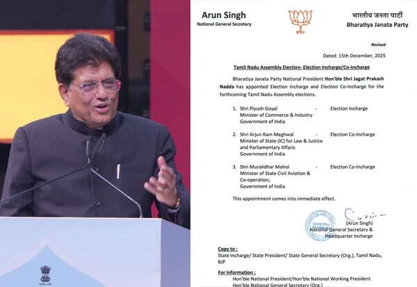 இந்நிலையில் இன்று (டிச.,15) 2026ம் ஆண்டு சட்டசபை தேர்தலையொட்டி 3 பேர் கொண்ட குழுவை பாஜ அமைத்து உள்ளது. பாஜக பொறுப்பாளர்களாக மத்திய அமைச்சர்கள் 3 பேர் களம் இறக்கப்பட்டு உள்ளனர். தேர்தல் பொறுப்பாளராக மத்திய அமைச்சர் பியூஷ் கோயலும், இணை பொறுப்பாளர்களாக அர்ஜுன் ராம் மேக்வால், முரளிதர் மோஹோல் நியமிக்கப்பட்டு உள்ளனர்.