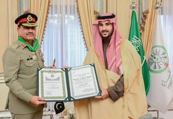 மேற்காசிய நாடான சவுதி அரேபியாவுக்கு, அசிம் முனீர் அரசுமுறைப் பயணமாக சென்றுள்ளார். அப்போது அவருக்கு சவுதி இளவரசர் காலித் பின் சல்மான் இந்த விருதை வழங்கினார். இது தேசிய சேவை, சிறந்த பங்களிப்பு போன்ற காரணங்களுக்காக வழங்கப்படுகிறது. அசிம் முனீர், இரு நாடுகளுக்கு இடையிலான உறவுகளை வலுப்படுத்துவதிலும், பாதுகாப்பு ஒத்துழைப்பை மேம்படுத்துவதிலும் ஆற்றிய பங்களிப்பை பாராட்டியே இந்த விருது வழங்கப்பட்டுள்ளதாக சவுதி அரசு தரப்பில் தெரிவிக்கப்பட்டது.