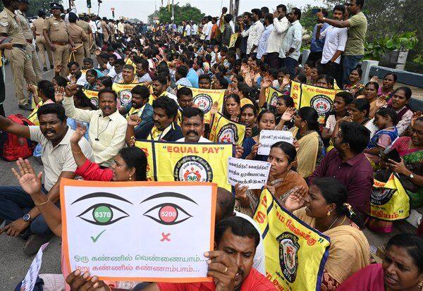 அரசு சம்பளம் பெரும் ஊழியரின் மிக மோசமான செயல், அவர்களது குழந்தைகளை போராட்ட களத்திற்கு கொண்டுவந்து, அழவைத்து ஊடகங்களில் காண்பிக்க வைத்து, கேவலமான பரிதாபத்தை பொதுமக்களிடம் தேடுவது. இது கண்டிக்கத்தக்கது. மேலும், இவர்களது வாரிசுகளை, குறைந்த சம்பளம் தரும் தனியார் பள்ளிகளில் சேர்த்துவிட்டு, அவர்கள் தரத்தை உறுதிசெய்துவிட்டு, இவர்கள் மட்டும் எவ்வளவு தான் சம்பளம் மற்றும் சலுகை தந்தாலும், போராடிக்கொண்டே இருப்பது. இவர்களின் தரம் தான் சந்தி சிரிக்கிறதே. தகுதி தேர்வில், தாய்மொழி பாடத்திலேயே அதிகமானோர் படுதோல்வி. தகுதி தேர்வு கூடாது, பணி சுமை கூடாது, பக்கத்து தெரு பள்ளிகளிலேயே வேலை வேண்டும். அரசின் கஜானா சாவியை இவர்கள் கையில் ஒப்படைத்து விடவேண்டும். முதலில் அரசு சம்பளம் பெரும் தேவையற்ற துறைகளை ஒழித்துக்கட்ட வேண்டும். அரசு பள்ளிகளில் சம்பளத்தை தவிர, பள்ளி மற்றும் ஆசிரியரின் தரம், நிர்வாகம் மற்றும் பாடத்திட்டம் ஆகியவற்றை கண்காணிக்க, ஒரு சிறந்த தனியார் குழுவிடம் ஒப்படைக்க வேண்டும். இதை உடனே செய்யுங்கள். பிறகு தானாகவே கூட்டம் கூட்டமாக ராஜினாமா கடிதத்தை கொடுத்துவிட்டு, பின்னங்கால் பிடரியில் பட, வீட்டுக்கு ஓடிவிடுவர்.