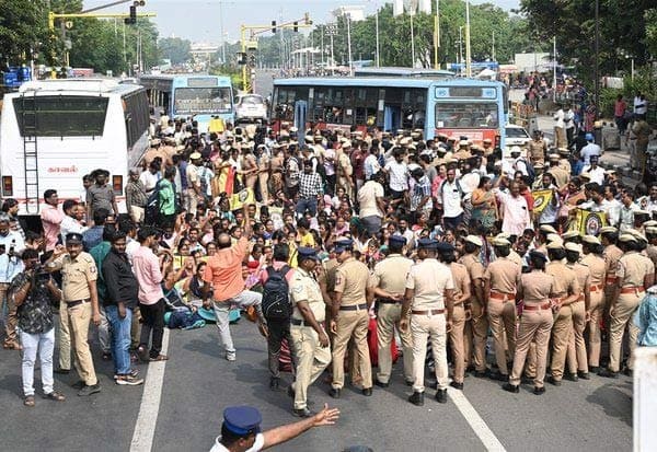 காந்தி இர்வின் மேம்பாலத்தின் ஒருபுறத்தில், இடைநிலை ஆசிரியர்கள் அமர்ந்து போராட்டம் நடத்தினர். தங்கள் கோரிக்கைகளை வலியுறுத்தி கோஷம் எழுப்பினர்.