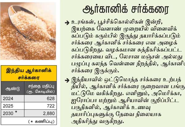 @block_B@ ஆர்கானிக் சர்க்கரை உரங்கள், பூச்சிக்கொல்லிகள் இன்றி, இயற்கை வேளாண் முறையில் விளைவிக்கப்படும் கரும்பில் இருந்து தயாரிக்கப்படும் சர்க்கரை ஆர்கானிக் சர்க்கரை என அழைக்கப்படுகிறது. வழக்கமான சுத்திகரிக்கப்பட்ட சர்க்கரையை விட, லேசான மஞ்சள் அல்லது பழுப்பு கலந்த வெள்ளை நிறத்தில், ஆர்கானிக் சர்க்கரை இருக்கும். இந்தியாவில் ஒட்டுமொத்த சர்க்கரை உற்பத்தியில், ஆர்கானிக் சர்க்கரை குறைவான பங்கு மட்டுமே வகிக்கிறது. எனினும், அமெரிக்கா, ஐரோப்பா மற்றும் ஆசியாவின் குறிப்பிட்ட பகுதிகளில், ஆர்கானிக் உணவு தயாரிப்புகளுக்கு தேவை நிலையாக அதிகரித்து வருகிறது.block_B