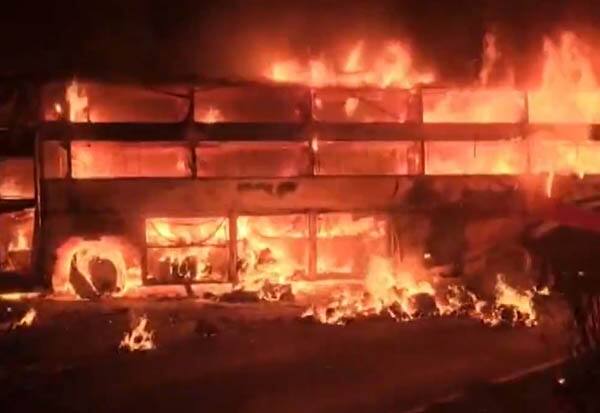 இதனால், ஓட்டுநரின் கட்டுப்பாட்டை இழந்த பஸ், சாலை தடுப்புச்சுவரை கடந்து, எதிரே வந்த கன்டெய்னர் லாரி மீது பயங்கரமாக மோதியது. இதில், பஸ்ஸில் தீப்பற்றியது. கொளுந்து விட்டு எரிந்த இந்த தீவிபத்தில் பஸ் மற்றும் லாரி ஓட்டுநர்கள் இருவரும், பஸ் கிளீனரும் என 3 பேர் உயிரிழந்தனர். பஸ்ஸில் இருந்த 36 பயணிகள் அதிர்ஷ்டவசமாக உயிர்தப்பினர்.
