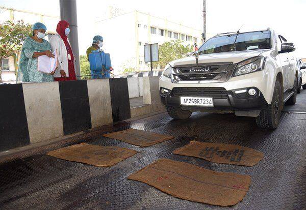 மேற்கண்ட எளாவூர் சோதனைச்சாவடியில், கிருமிநாசினி தெளிக்கும் ஸ்பிரேயர் இயந்திரம் பழுதானதால், அதிலிருந்து கிருமிநாசினி தெளிக்க முடியாமல் போனது.