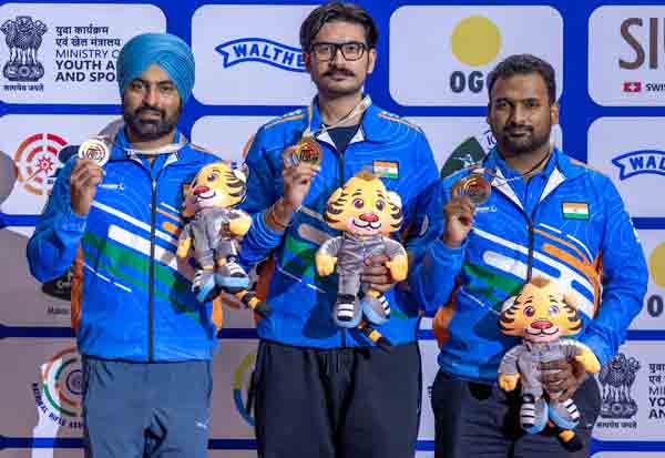 ஆண்களுக்கான 25 மீ., 'சென்டர் பயர் பிஸ்டல்' அணிகள் பிரிவில் அமன்பிரீத் சிங், குர்பிரீத் சிங், அங்கூர் கோயல் அடங்கிய இந்திய அணி, 1743.55 புள்ளிகளுடன் தங்கத்தை தட்டிச் சென்றது.