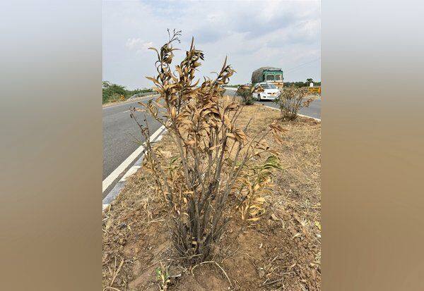 நான்கு வழிச்சாலையில் தண்ணீரின்றி கருகும் செடிகள்